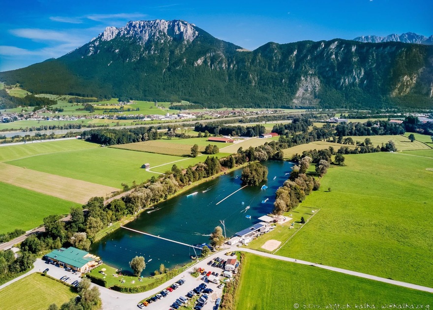 Wasserski & Wakeboard Kiefersfelden in Kiefersfelden, Germany, has become one of the most exclusive and sought-after places in Germany, especially for water sports fans. We have a "Little BRO" - a lift especially for beginners. It has been part of the Kiefersfelden water ski and wakeboard cable car. This enables all beginners to learn how to start and the first meters on the water quickly and easily, separately from the large lift. The glass building behind the terrace, built in 2010, now also offers a warm and dry place to relax on cold, rainy days. The water ski facility in Kiefersfelden stands out from other facilities in Germany and is a very special place for people who love something special, especially due to the high quality of the catering, service and the unique view of the beautiful Kaiser Mountains. At the foot of the Zahmer Kaiser you can also spend your time playing volleyball or football, swimming and enjoying a delicious meal in the restaurant.